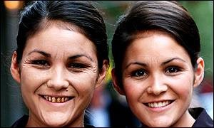 親子ではありません。喫煙すると外見にどのような違いが出るのか、22歳の双子の姉妹の40歳を想定して作成されたものです。